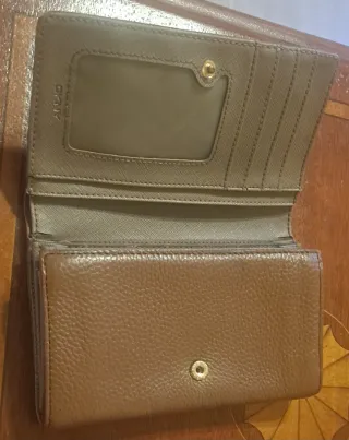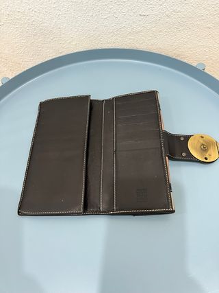 Elegante cartera de piel en color marrón. - Diseño clásico y funcional. - Cierre con trabilla y botón. - Compartimentos interiores.