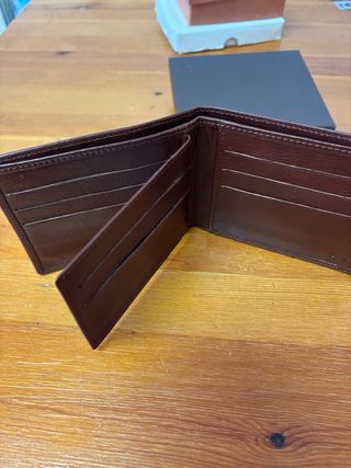 Cartera de piel en color marrón, completamente nueva. - Múltiples ranuras para tarjetas. - Lleva la marca de Caixa bank en la parte baja interior de la cartera, Confeccionada en piel marrón