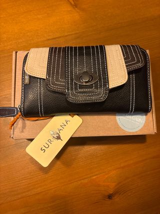 Elegante cartera de piel auténtica de la firma Surkana. Combina tonos negros y beige con un diseño moderno. - Cierre de broche metálico. - Costuras decorativas en contraste. - Compartimentos interiores organizados.