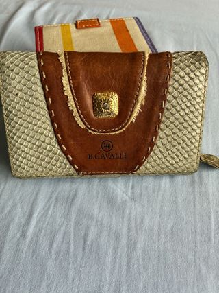 Elegante cartera de la marca B. Cavalli, con un diseño único que combina texturas. - Exterior con efecto piel de serpiente en tono beige. - Detalle de solapa y ribetes en cuero marrón. - Adorno metálico dorado en la solapa. - Logo de la marca grabado en cuero.