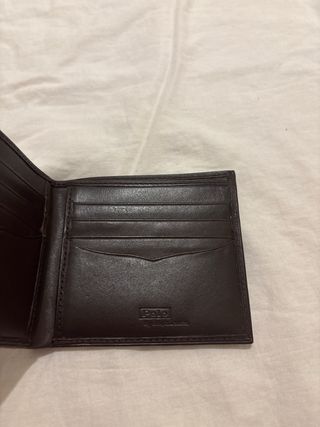 Elegante cartera de Polo Ralph Lauren con un diseño distintivo. - Color azul marino con detalles bordados en dorado. - Escudo emblemático de la marca. - Acabado en piel marrón en los bordes.