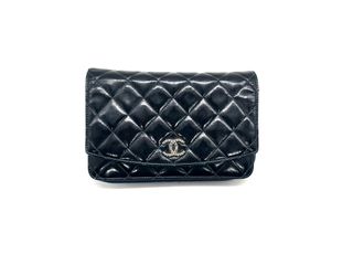 Chanel Wallet on Chain (WOC) original, en piel negra acolchada con cadena plateada. Interior azul con tarjetero y cremallera. Medidas 19x12x3 cm. En muy buen estado, 100 % auténtico. Barcelona 0633