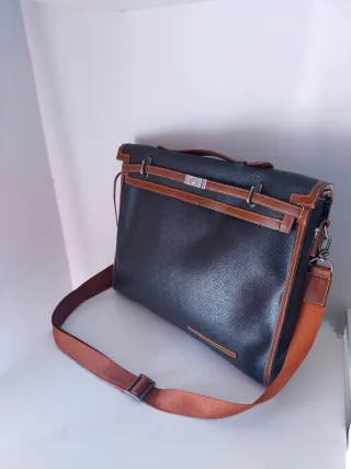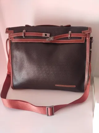 Preciosa cartera de piel autentica marrón, tipo bandolera y con asa de mano. Es de tamaño considerable ( 40 por 30 por 7 cm) y tiene un aspecto elegante y cuidado. Muy poco usada y con interior de ante y compartimentos variados para clasificar bolis y documentos . El asa bandolera tiene uno de los cierres que si llevas mucho peso se sale , pero se puede apretar para cerrarlo mejor ( yo no tengo fuerza ). Es una cartera UNISEX . La piel tiene algun pequeño roce del uso .Asa larga regulable para llevarla al hombro o cruzada.Cierre con dos hebillas metálicas.Piel de textura ligeramente rugosa.