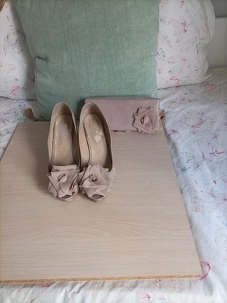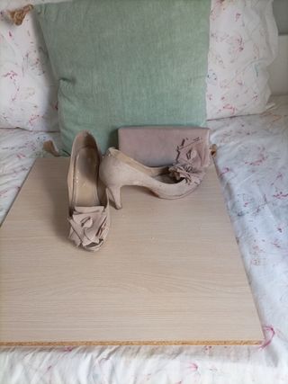 zapato con tacón de 8cm en piel adorno de una rosa en tela y bolso a juego opcional en 15e