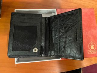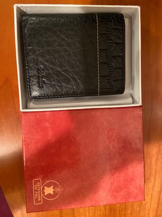 Elegante cartera billetera para hombre. - Fabricada en cuero. - Diseño vertical. - Múltiples compartimentos para tarjetas y billetes. - Incluye tarjetero extraíble. Nueva, sin uso, con pérdida de estrellas en la tapa, al natural no se aprecia prácticamente.