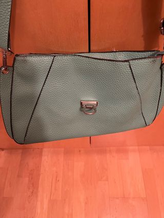 Bolso imitación piel, tipo cartera con asa para colgar al hombro. Cierre exterior y cremallera, el interior en marrón chocolate, bolsillo interior con cremallera en mismo tono y en el otro latera pequeño bolsillo abierto en turquesa. Dims: 34x19cm, con asa desde 45cm, correa regulable.