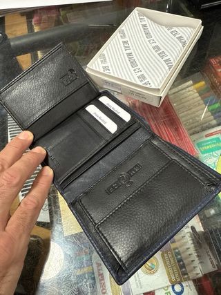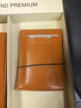 Elegante set de Real Madrid, nuevo. Incluye una cartera y un tarjetero a juego. Ambos están hechos de piel negra de excelente calidad y presentan el logo del Real Madrid. - Diseño sofisticado y práctico. - Perfectos para el uso diario. - Ideales para regalar.