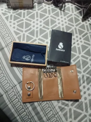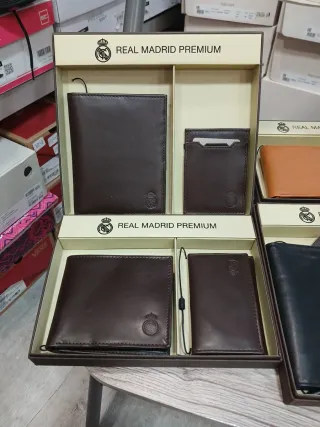 Conjunto de accesorios de piel con el escudo del Real Madrid. - Cartera marrón. - Tarjetero marrón. - Cartera negra. - Llavero. Tenemos variedad de productos de Real Madrid. Vienen en sus cajas