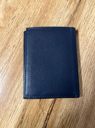 Elegante cartera billetero de piel de vacuno. - Color azul oscuro. - Diseño clásico y funcional. - Pequeño detalle de las franjas tipo Tommy Hilfiger..