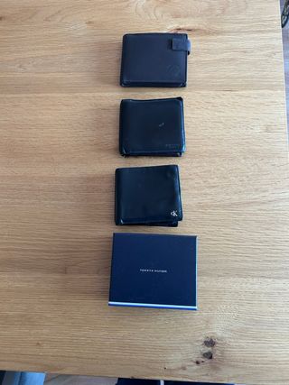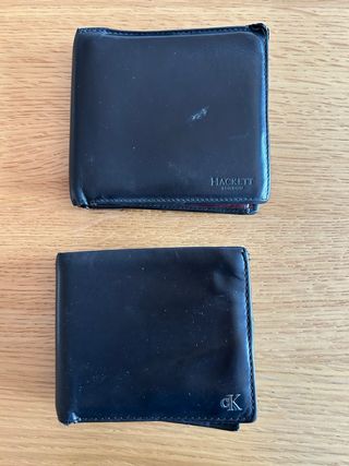 Conjunto de tres carteras de piel para hombre: - una de ellas color negro con el interior marron de piel marca Hackett London. Usada - otra de ellas color negro con el interior negro de piel marca Calvin Klein. Usada - y por ultimo una cartera nueva de polipiel color marrón marca El Caballo. Las 3 llevan monedo. Son pequeñas y compactas.