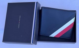 Cartera de cuero auténtico de la marca Tommy Hilfiger. En precioso estuche de piel azul marino con pespunte rojos. - Protección RFID. - Diseño de billetera y valet.