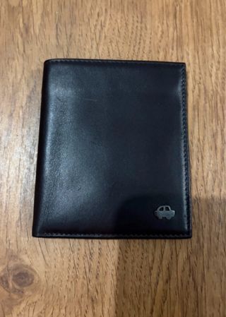 Elegante cartera de piel con un diseño distintivo. - Combinación de colores negro y marrón. - Detalle de logo de la marca.