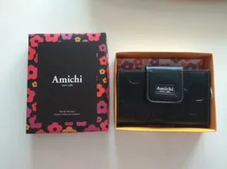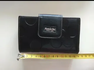 Cartera de piel en color negro con muchos compartimentos, mide unos 14 cm, es hecha a mano en Ubrique (España), es nueva sin estrenar, marca Amichi, costó 37€