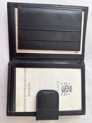 Cartera de piel para documentos con un tamaño de 12x17 cm. Presenta un cierre de solapa y un discreto logo grabado. - Material: Piel genuina. - Medidas: 12 x 17 cm. - Cierre: Solapa con botón a presión. - Detalle: Logo grabado en relieve.