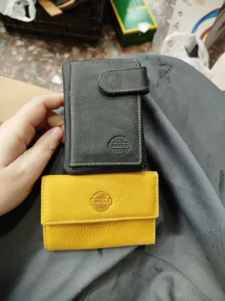Conjunto de dos carteras de piel. - Una cartera de color negro. - Una cartera de color amarillo. Para llevar llaves y monedero a la vez
