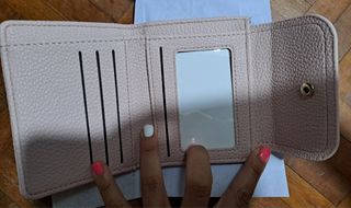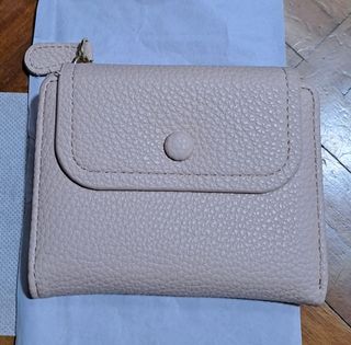 Preciosa cartera pequeña, sin usar. Es de color beige claro y tiene un diseño elegante y discreto. - Material: Piel sintética. - Cierre de botón. - Compartimento para tarjetas y billetes. - Incluye un bolsillo con cierre de cremallera.