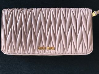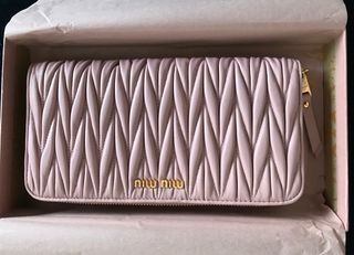 Cartera de piel Miu Miu en un bonito tono rosa palo. Presenta un diseño acolchado muy característico. - Cierre de cremallera. - Detalle de logo metálico dorado. - Incluye tira para muñeca. - A estrenar - Con certificado de autenticidad - Medidas: 20 x 11