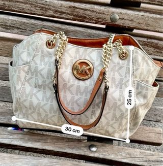Conjunto de bolso y cartera de la marca Michael Kors. El bolso tiene un diseño con el monograma de la marca en tonos beige y marrón, con detalles en piel y cadena dorada. La cartera a juego también presenta el monograma y el distintivo logo de la marca. - Bolso con monograma. - Cartera a juego. - Detalles en piel. - Cadena dorada.