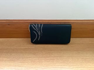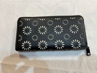 Elegante cartera monedero con un diseño único. - Acabado en negro con detalles troquelados. - Estampado de flores. - Cierre de cremallera. Dimensiones: 21 x 11 x 3 cm. Muy buen estado