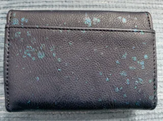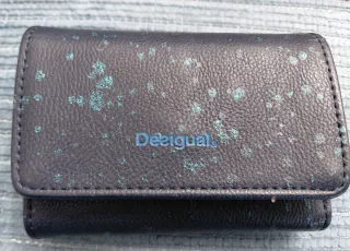 Cartera monedero de la marca Desigual con un diseño original. Color azul marino con destellos. Departamento con cremallera para monedas y múltiples departamentos. Muy buen estado. - Cierre de botón a presión. - Detalle de manchas azules sobre fondo azul marino. - Pequeño detalle metálico dorado en el interior.