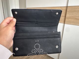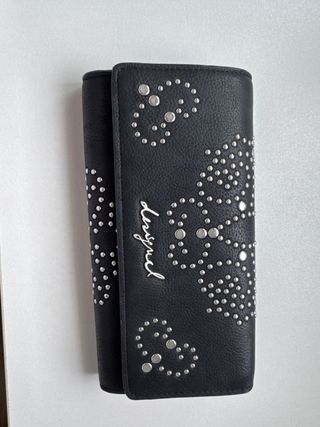Elegante cartera de la marca Desigual, con un diseño llamativo. - Adornada con tachuelas plateadas. - Incluye tarjetero con cadena.