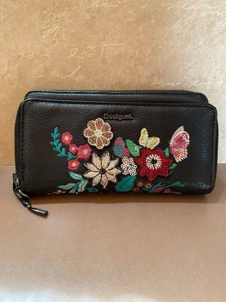 Elegante cartera de la marca Desigual. - Diseño con detalles bordados y pedrería. - Cierre de cremallera. - Logo de la marca en relieve.