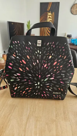 Bolso mochila de la marca Desigual muy práctica. - Tiene tres compartimentos grandes. - Un bolsillo pequeño interior en uno de los compartimentos. -Un bolsillo pequeño exterior, en la zona de la espalda (bolsillo antirobo) para meter la cartera y que no te la roben. -Cierre de seguridad metálico y cremalleras. - 3 Asas, para llevarla como mochila, bolso de mano y bolso de hombro. - Color negro con detalles multicolor. - Acabado con perforaciones.