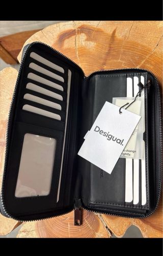 Elegante cartera billetero de la marca Desigual. Un accesorio práctico y con estilo. - Diseño distintivo de la marca. - Compartimentos interiores para tarjetas y billetes. Regalo la cartera de las últimas fotos.