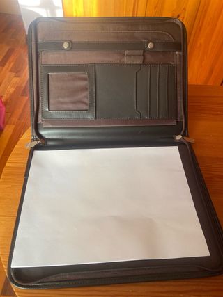 Carpeta profesional negra, ideal para llevar documentos importantes. Está en muy buen estado. - Diseño elegante y funcional. - Compartimento principal amplio. - Bolsillos adicionales para tarjetas y accesorios. - Cierre de cremallera segura.