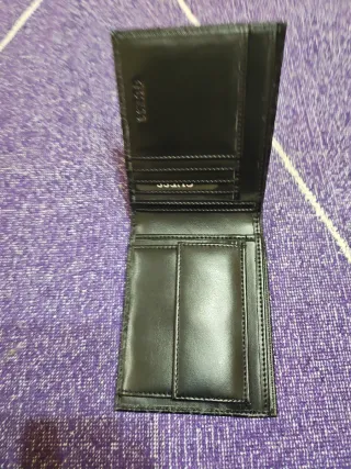 Elegante cartera de la marca Guess. - Diseño compacto y funcional. - Compartimentos interiores para tarjetas. - Cierre de botón a presión. - Bolsillo exterior con cremallera.