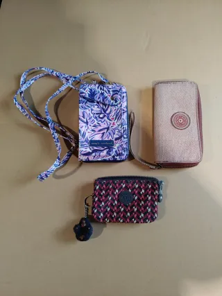 Lote de tres carteras, dos de la marca Kipling y una de Simply Southern. Ideal para organizar tus pertenencias. - Cartera Kipling con estampado geométrico y llavero. - Cartera Kipling en tono beige con detalle circular. - Cartera Simply Southern con estampado floral y correa.