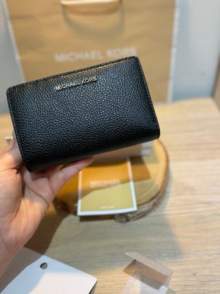 ✨ Cartera Michael Kors Negra✨ Elegante y práctica, fabricada en piel granulada con acabado premium 🤍 Cuenta con monedero central con cremallera, compartimentos laterales y ranuras para tarjetas, cierre con botón a presión y logo dorado icónico. 📏 Medidas: 11,5 × 8,5 × 3 cm ✔️ 100% original Michael Kors ✔️ Nueva, con caja y etiquetas ✔️ Incluye certificado de autenticidad y código QR 💫 Un básico sofisticado para el día a día o un regalo perfecto