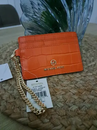 Elegante tarjetero Michael Kors en un vibrante color naranja. Cuenta con una cadena dorada para mayor comodidad y estilo. - Diseño texturizado. - Logo metálico de Michael Kors. - Incluye etiquetas originales.