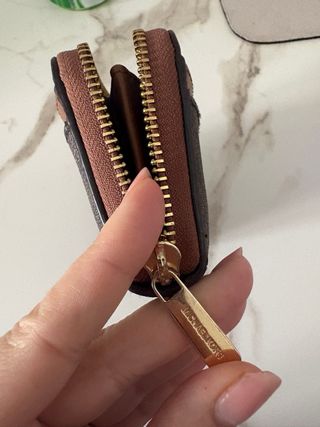 Pequeña cartera de la marca Michael Kors con un diseño elegante. - Estampado de monograma en marrón. - Detalles metálicos en tono dorado. - Cremallera para cierre.