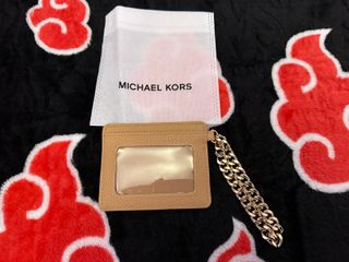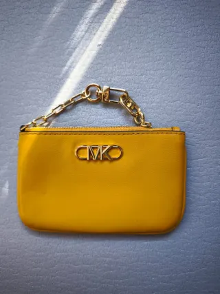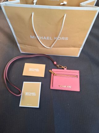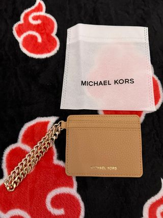 Elegante tarjetero de la marca Michael Kors, perfecto para llevar tus tarjetas esenciales. - Acabado en piel texturizada. - Incluye una cadena dorada para mayor comodidad. - Logo de la marca grabado en la parte frontal. No se ha usado nunca.