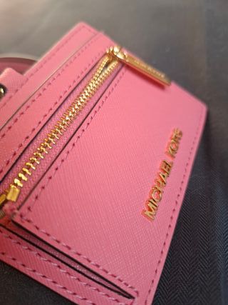 Práctica cartera de Michael Kors en color rosa, ideal para llevar tus tarjetas y algo de efectivo. - Incluye lanyard a juego. - Compartimento con cremallera. - Logo metálico de la marca.
