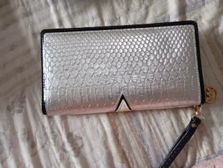 Elegante cartera grande de piel granulada en color plata. - Cierre de cremallera. - Con correa de mano, compartimentos y cremallera en el interior. - Incluye la caja original.
