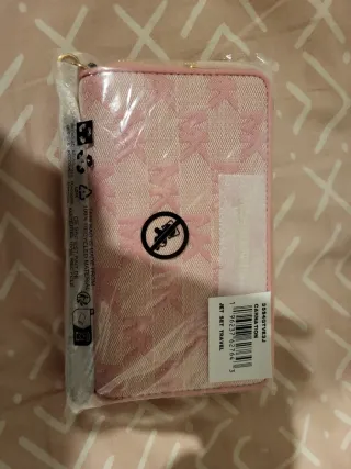 Elegante cartera Michael Kors. - Diseño en color rosa con detalles dorados. - Cierre de cremallera. - Logo de la marca en relieve.