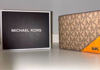 Cartera de la marca Michael Kors con un diseño distintivo. - Patrón MK clásico en tono beige. - Detalle en color naranja vibrante. - Logo metálico MK en la parte frontal.
