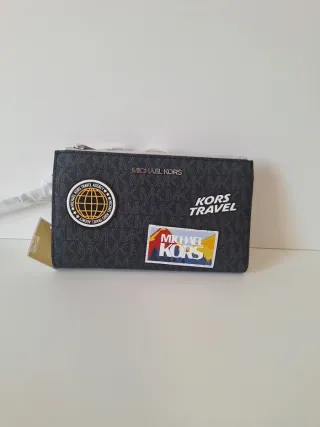 Cartera Michael Kors con un diseño llamativo y moderno. - Estampado MK característico. - Parche frontal con diseño de globo terráqueo y Michael Kors Travel Agency. - Parche trasero con Kors Travel y paisaje. - Cremallera superior para cierre.