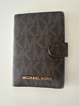 Elegante tarjetero Michael Kors con el distintivo monograma. - Diseño en tono marrón. - Acabado metálico dorado para el logo. precio negociable
