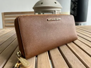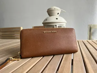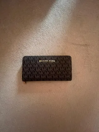 Cartera de la marca Michael Kors con un diseño elegante. - Color marrón con detalles dorados. - Logo metálico de la marca en la parte frontal.