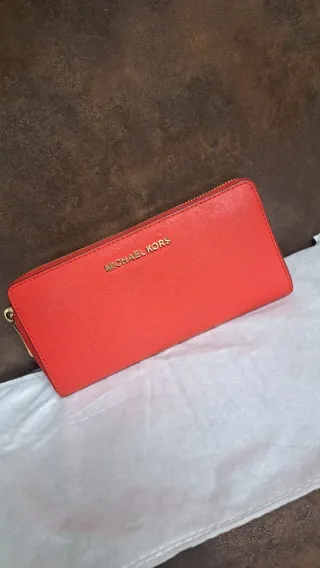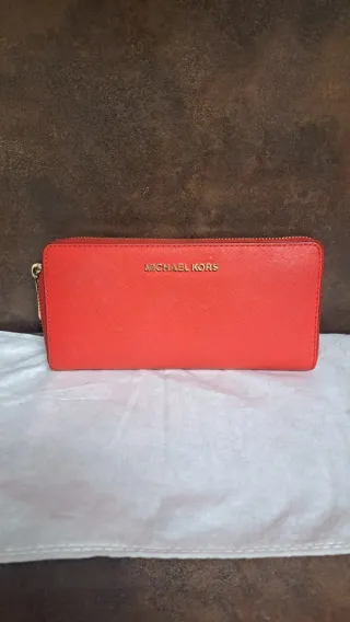 Elegante cartera Michael Kors en un vibrante color rojo. Su diseño alargado y cierre completo la hacen práctica y estilosa. Original. - Logo metálico de la marca. - Cierre de cremallera dorada.