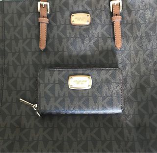 Elegante conjunto de bolso y cartera billetera Michael Kors con el icónico estampado monogram. - Bolso grande con detalles en piel. - Cartera a juego con cierre de cremallera.