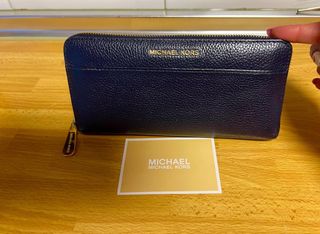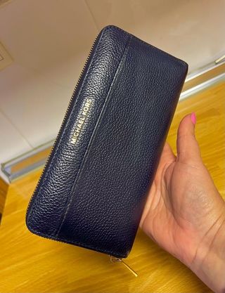 Cartera grande en piel granulada. Color azul marino con detalles en dorado. Esta nueva prácticamente. No se ha usado apenas. Cuenta con muchos compartimentos en su interior y un bolsillo exterior en la parte trasera.