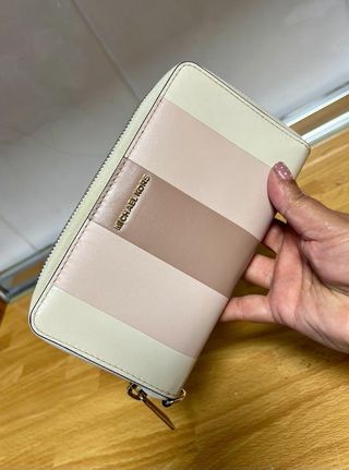 Cartera en piel. En tonos rosa y crema con detalles en dorado. Esta nueva prácticamente. No se ha usado apenas. Dimensiones, 17.5cm largo x 10cm alto x 2.5cm fondo.