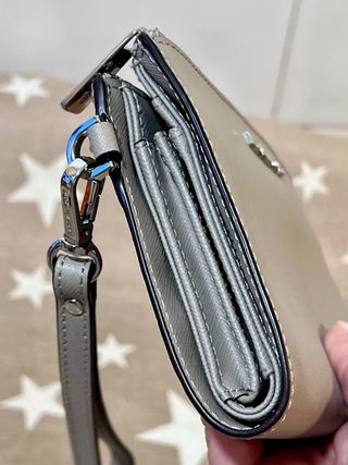 Cartera en piel saffiano. Modelo Adele. Color gris con detalles en plateado. Esta nueva. Artículo de exposición. Con bastantes compartimentos en su interior, billetera y espacio para el móvil. Dimensiones, 18.5cm largo x 11cm alto x 2cm fondo.