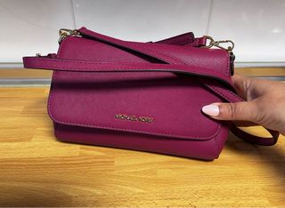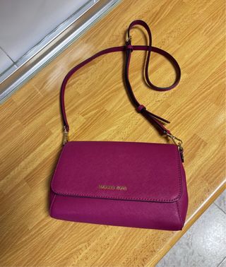 Bolso bandolera en piel saffiano. Color rojo / fresa con detalles en dorado. Nuevo prácticamente. Apenas sin uso. Asa bandolera regulable y extraible para llevarlo como una cartera de mano. Bolsillo exterior en la parte trasera. Medidas, 24cm de largo x 14cm de alto x 5cm de fondo.