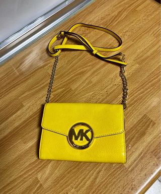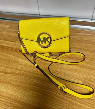 Bolso bandolera en piel. Color amarillo con detalles en dorado. Nuevo. Sin uso. Una diminuta marca en la parte trasera. Muchos compartimentos. Un bolsillo en la parte posterior. Asa bandolera regulable y extraible para llevarlo como cartera de mano. Medidas, 17.5cm de largo x 12cm de alto x 2.5cm de fondo.