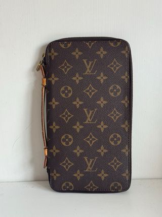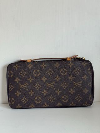 Nombre Louis Vuitton Zippy Handle Wallet Monogram Canvas Estado Muy buen estado (con ligeras señales de uso) Dimensiones • Ancho: 24 cm • Alto: 14 cm • Profundidad: 2 cm Descripción Elegante y funcional cartera Louis Vuitton Zippy Handle confeccionada en el icónico canvas Monogram, con detalles en piel natural y herrajes dorados. El diseño con cierre perimetral se abre a un interior bien organizado con múltiples ranuras para tarjetas, compartimentos para billetes y documentos, y un bolsillo con botón a presión para monedas. El interior de piel presenta leves señales de uso acordes al tiempo, mientras que el exterior de canvas se